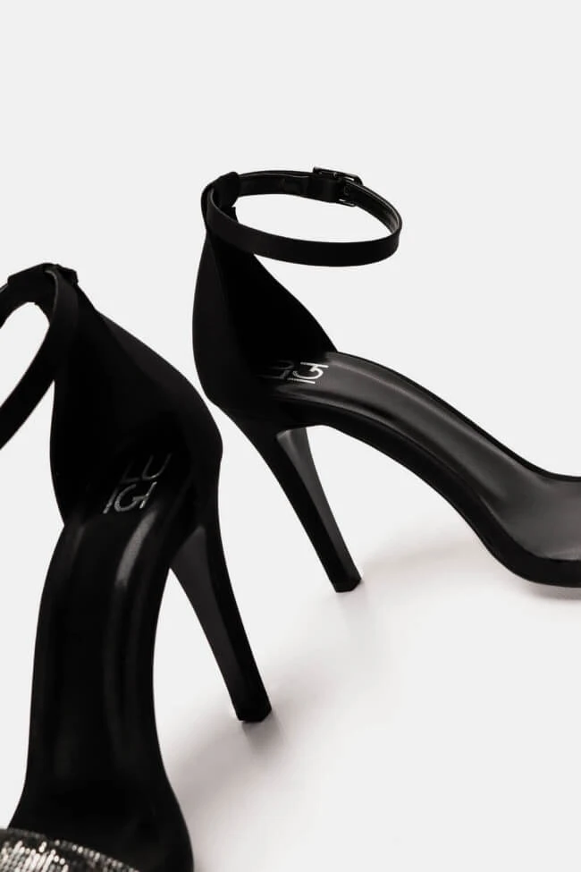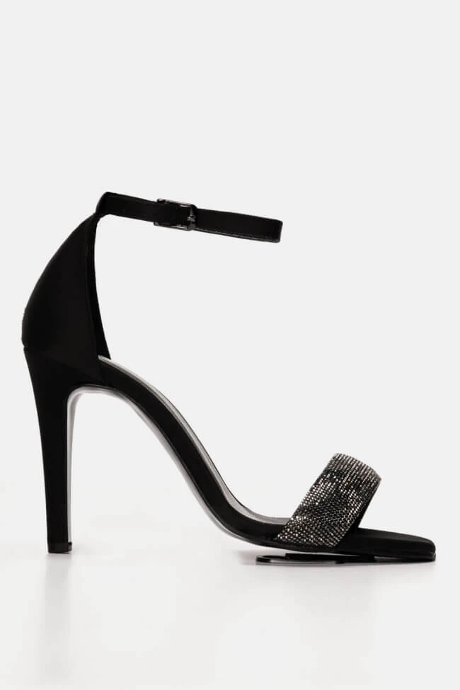 Πέδιλα με σατέν υφή και στρας. Δένει με λουράκι στον αστράγαλο.